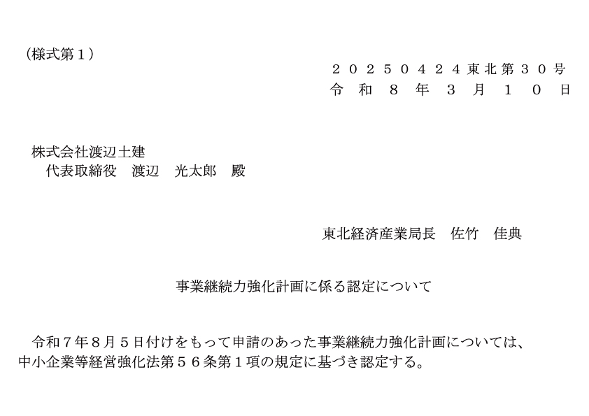 東北経済産業局より事業継続力強化計画に係る認定を頂きました